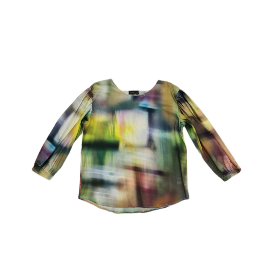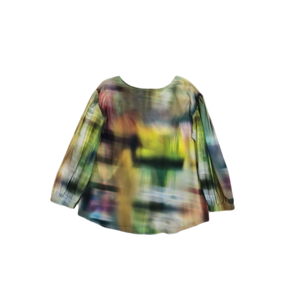 Trasforma ogni uscita in una sfilata personale. La nostra blusa con stampa astratta fonde armoniosamente tonalità verde smeraldo, giallo solare e accenti di viola, creando un effetto visivo di movimento e profondità unico.